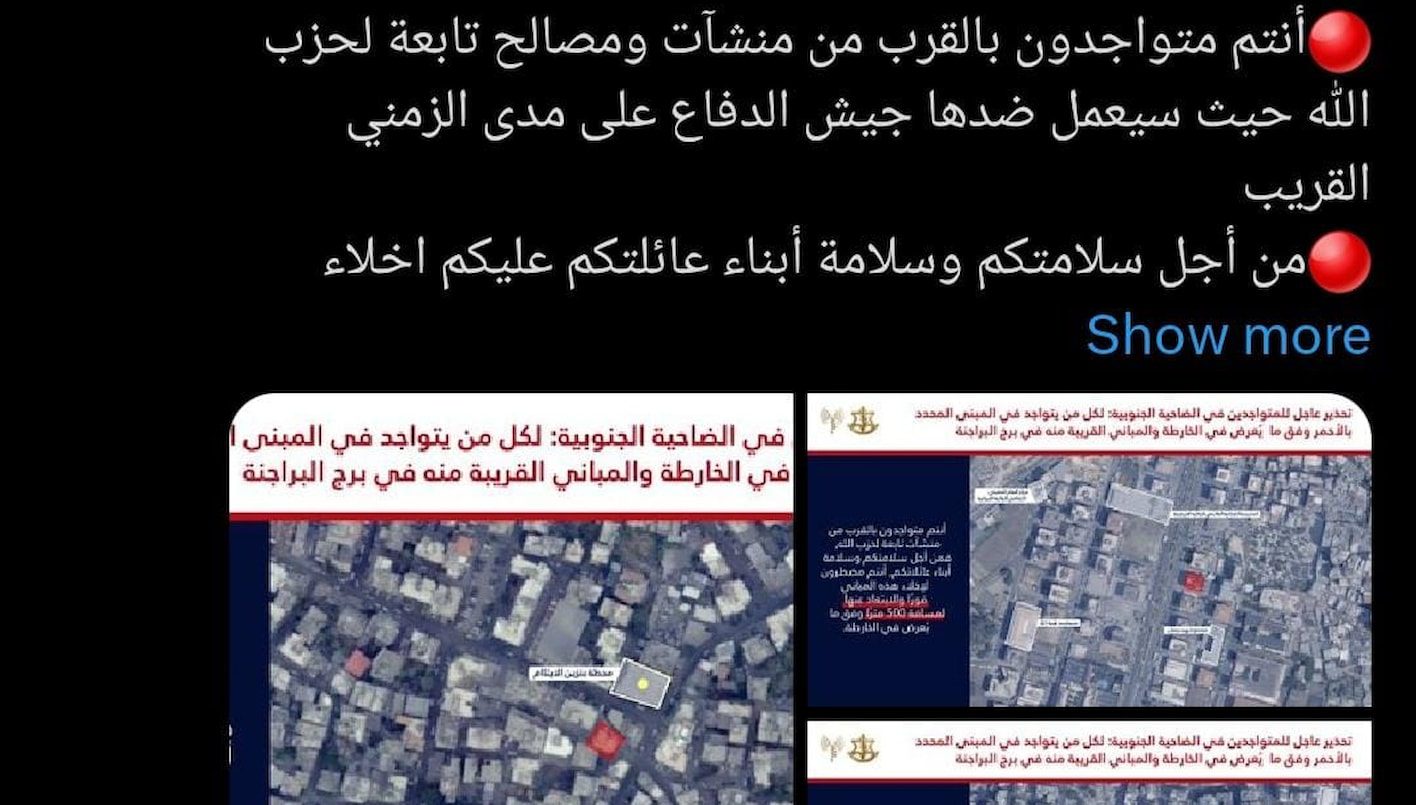 دعا المتحدث باسم الجيش الاسرائيلي للاعلام العربي أفيخاي أدرعي سكان برج البراجنة بالاخلاء وفق الخريطة المنشورة....