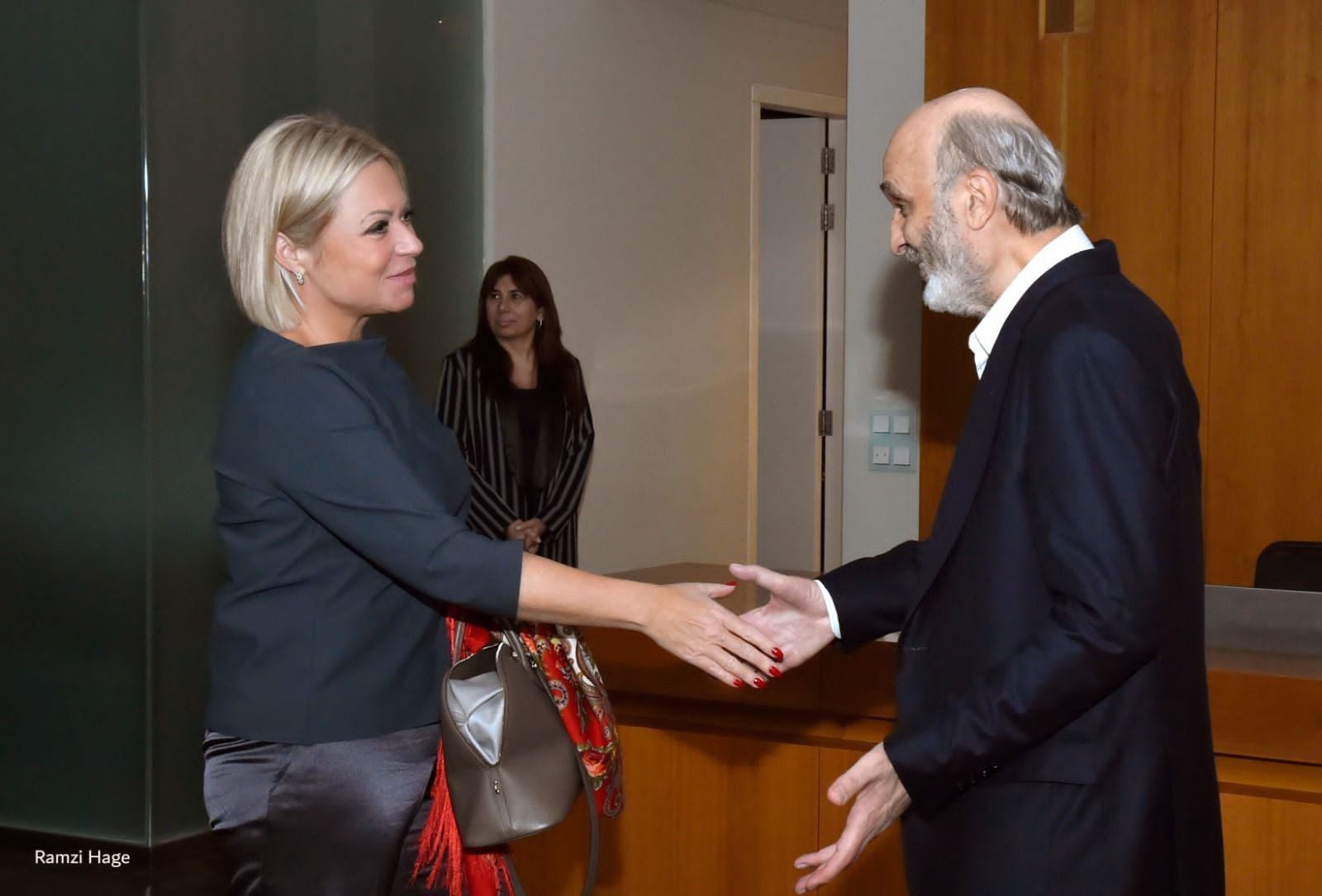 استقبل رئيس حزب \"القوات اللبنانية\" سمير جعجع، في معراب، المنسّقة الخاصّة للأمم المتّحدة في لبنان جينين هينيس-بلاسخارت ...
