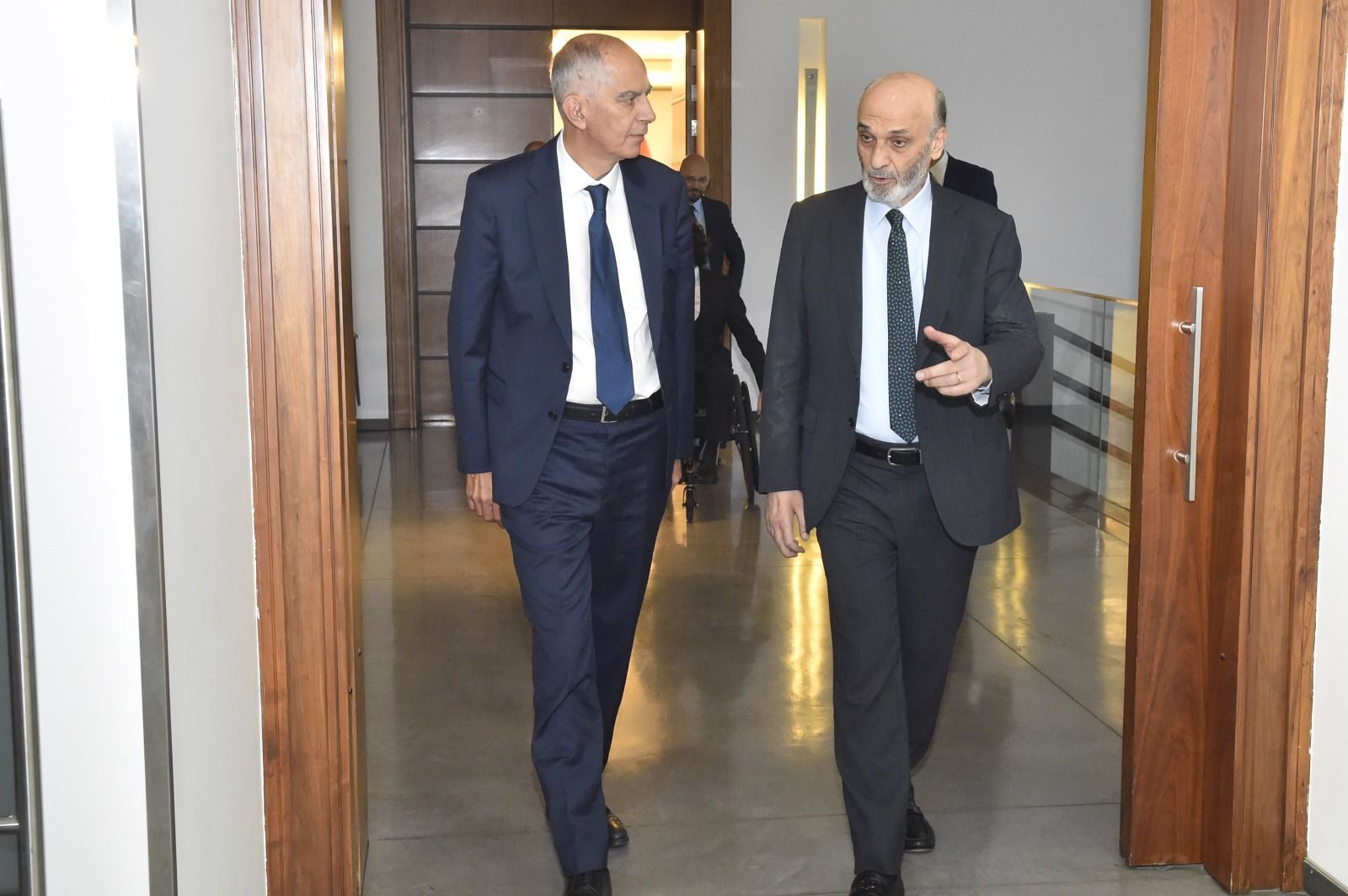 التقى رئيس حزب القوات اللبنانية سمير جعجع في معراب السفير الفرنسي الجديد في لبنان هيرفيه ماغرو يرافقه الملحق السياسي Que...