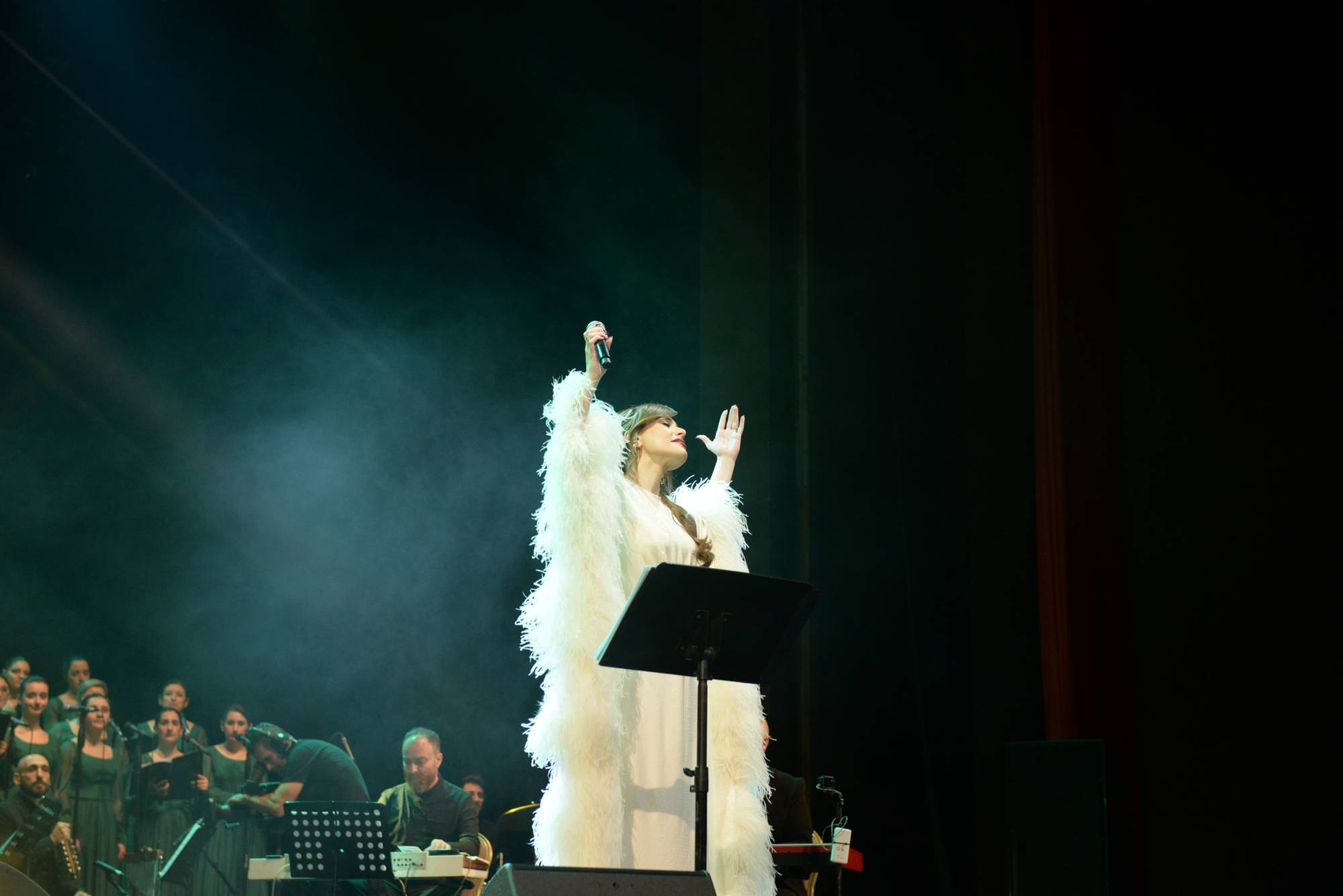 فاطمة عبدالله - الفستان الأبيض بأكمامه المزيّنة بالريش، أرادت به الفنانة عبير نعمة وقائدة أوركسترا جوقة «فيلوكاليا» الأخ...