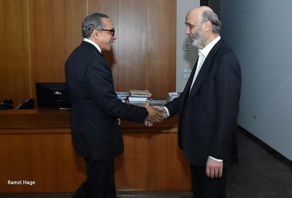 عرض رئيس حزب \"القوّات اللبنانيّة\" سمير جعجع في معراب مع سفير جمهوريّة مصر العربيّة في لبنان علاء موسى لمستجدات لبنان و...